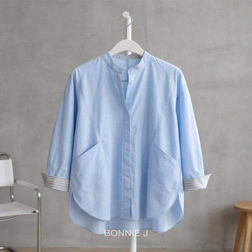 [보니제이]스트라이프 소매 배색 루즈핏 롱 셔츠 체형커버 벌룬
