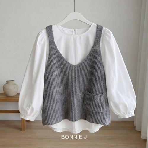 [보니제이]포켓 브이넥 니트 베스트 + 벌룬 블라우스 세트 청순