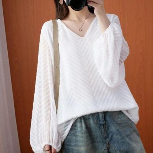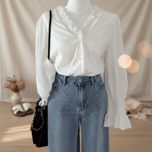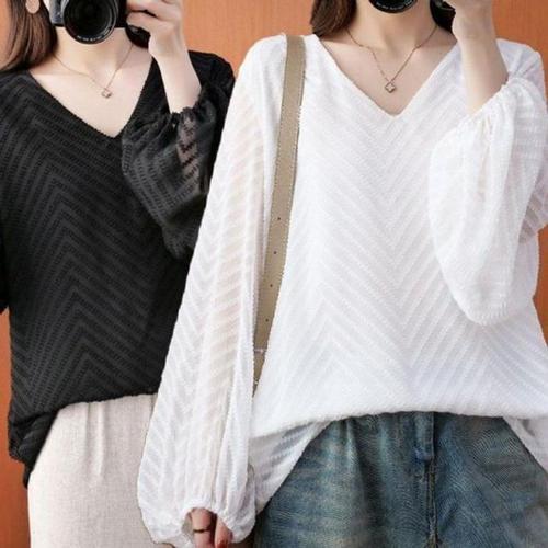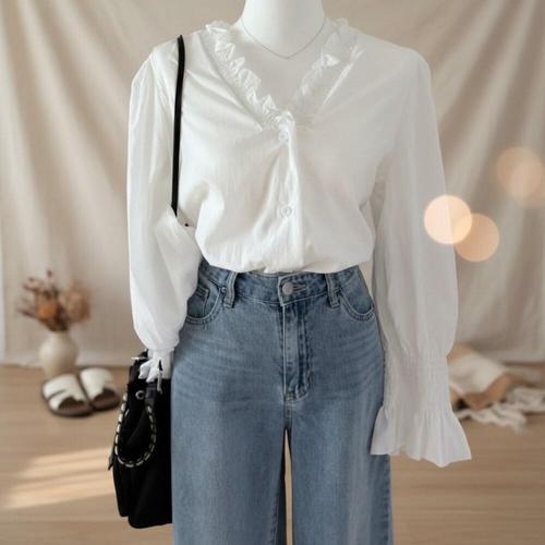[오너클랜]인기상품 여성용 시스루 쉬폰 브이넥 긴팔 벌룬 봄가을 화이트 블라우스 셔츠 [WFLLKC4_260305]