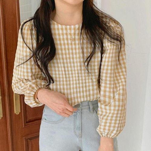 엘리몬드 벌룬 소매 루즈핏 라운드 단추 포인트 체크 블라우스 여성상의 차르르 봄옷 가을옷 패