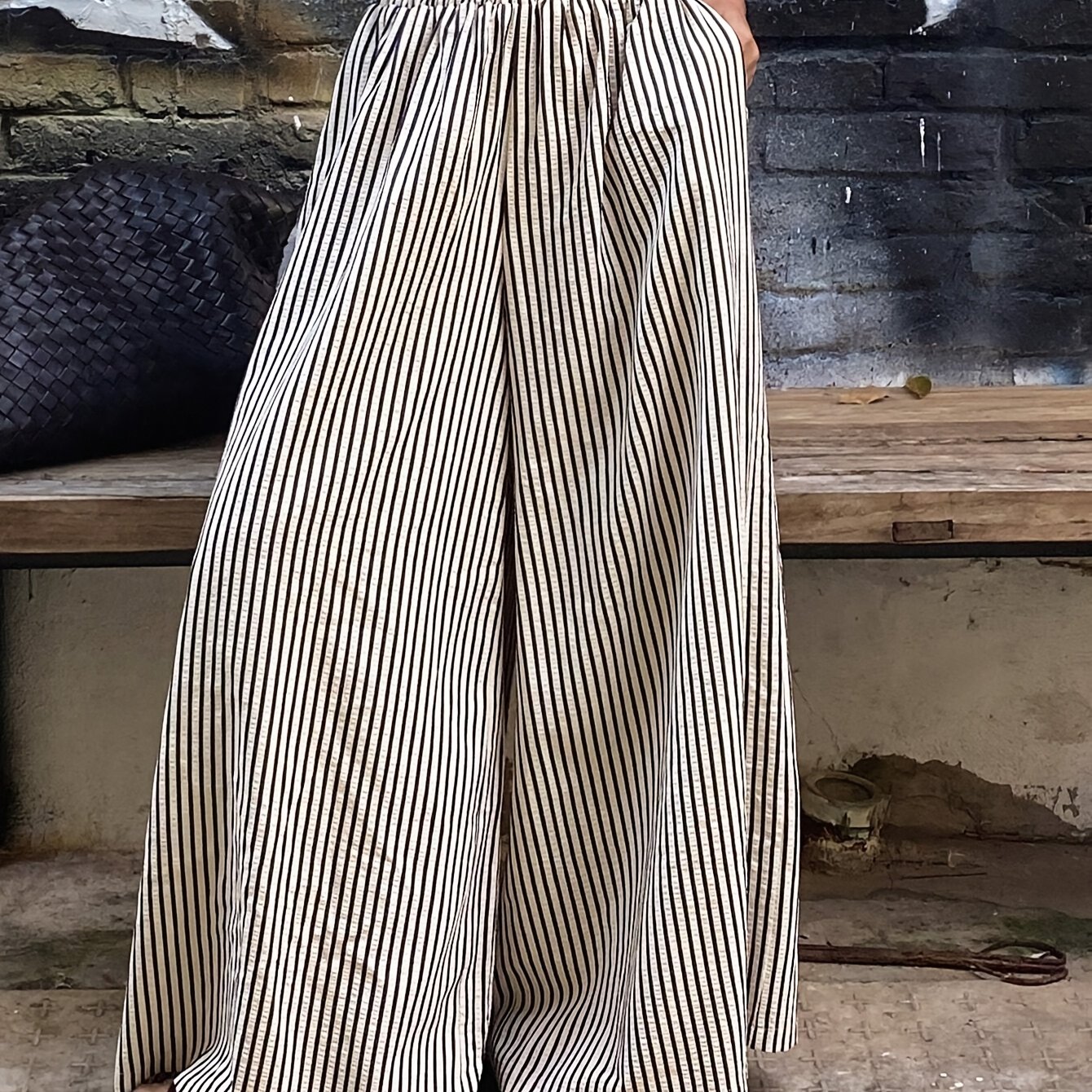 TEMU 여성용 와이드 레그 팬츠, 신축성 허리 - 캐주얼 폴리에스터, 세탁기 사용 가능, 고대비 수직 , 사계절 내내 편안한 착용