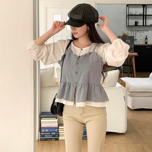 [미라클세븐]여성 체크 패턴 페플럼 뷔스티에 레이어드 블라우스