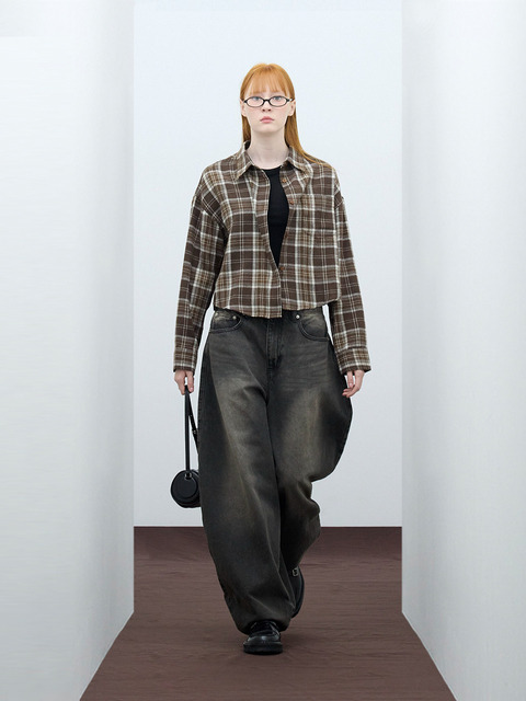 [비바브라운] 85-VIVA088 하운드 크롭 긴팔 체크 셔츠 브라운
