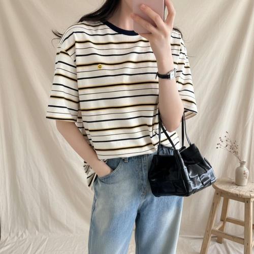/신상오픈런 여성용 루즈핏 스트라이프 반팔 스마일 디자인