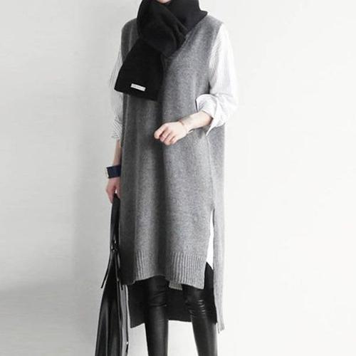 [엄지척]모던 스타일 여성 롱니트 베스트 브이넥 밑단 절개_20360963_667501