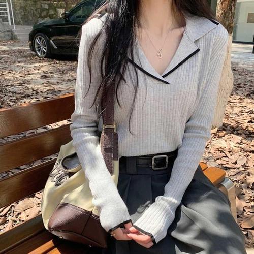 [주식회사 브이와이][JHQRJR0X_4B]여성 카라니트 브이넥 배색 골지 긴팔 니트 (24019461A)