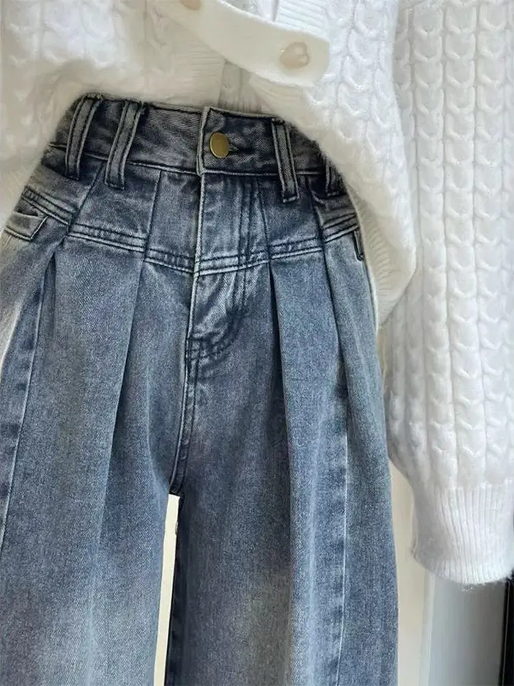 라이트 워싱 플리츠 와이드 레그 데님 진 여성용 하이웨이스트 빈티지 루즈 스트레이트 롱 팬츠 2026년 봄 신상품