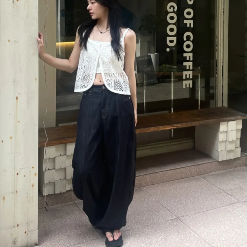와이드 레그 팬츠 청바지 여성 레이스 홀 데님 하이 웨이스트 디스트레스드 워시드 스트릿웨어 루즈 트라우저 빈티지 플로어 기장 2025