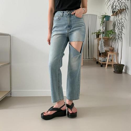 [다잇템]여성 하프 슬릿 빈티지 양쪽 H라인 진 팬츠 (11097195A)