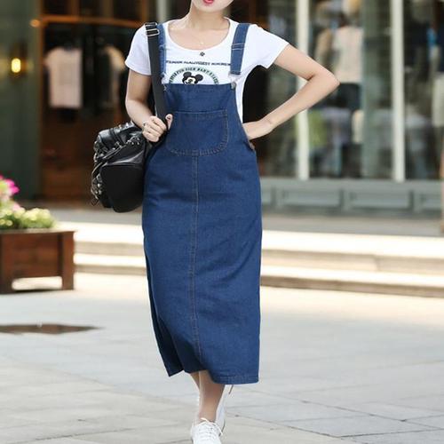 [다잇템]여자 진청 일자 스커트 서스펜더 진 롱 원피스 (10583709A)