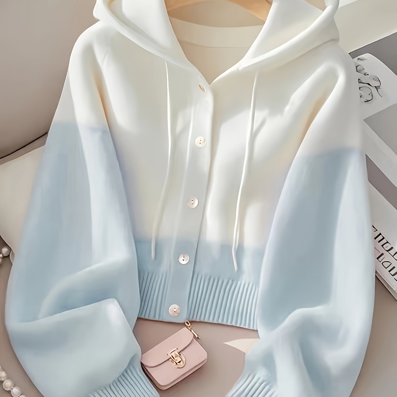 TEMU 여성용 루즈핏 후드 가디건 - 화이트 대비 스웨터, 미디엄 스트레치 원단 세탁기 사용 가능, 사계절 캐주얼 필수 패션 편안한 풀오버 트렌디 스타일 프론트 버튼 코트