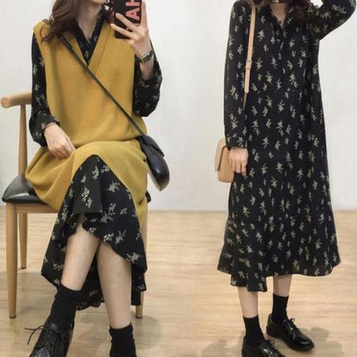 [다잇템]여자 들러리룩 검정 꽃무늬 남방 롱 원피스 (10592880A)