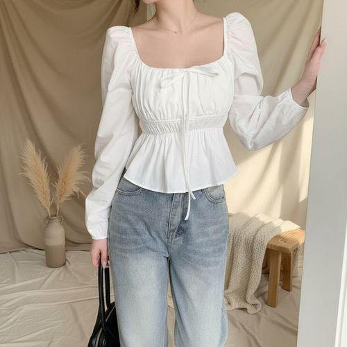 [옷자락]여성 스퀘어넥 리본 스트링 블라우스 퍼프소매 셔링 밴딩허리