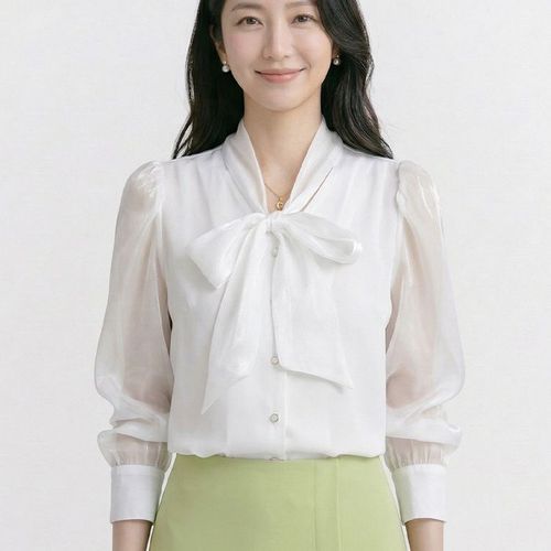 NB3125 여성 리본 타이 시스루 퍼프소매 긴팔 블라우스