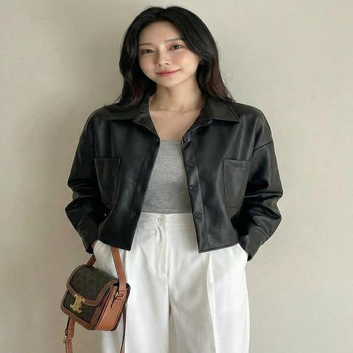 블랙 PU 가죽 바이커 재킷 숏 디자인 여성용 봄 가을 탑 트렌디한 플립 칼라 오토바이 스타일 코트