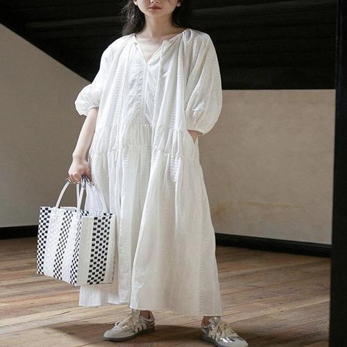 (신상 추천) 90kg까지 1+1 빅사이즈 여성 순면 자수 에스닉 원피스 봄 여름 편한 복고풍 단아한 에어리 허리꼬임 9부소매 미디 a라인 휴양지 핀턱 라운드넥 클래식 면 원피스