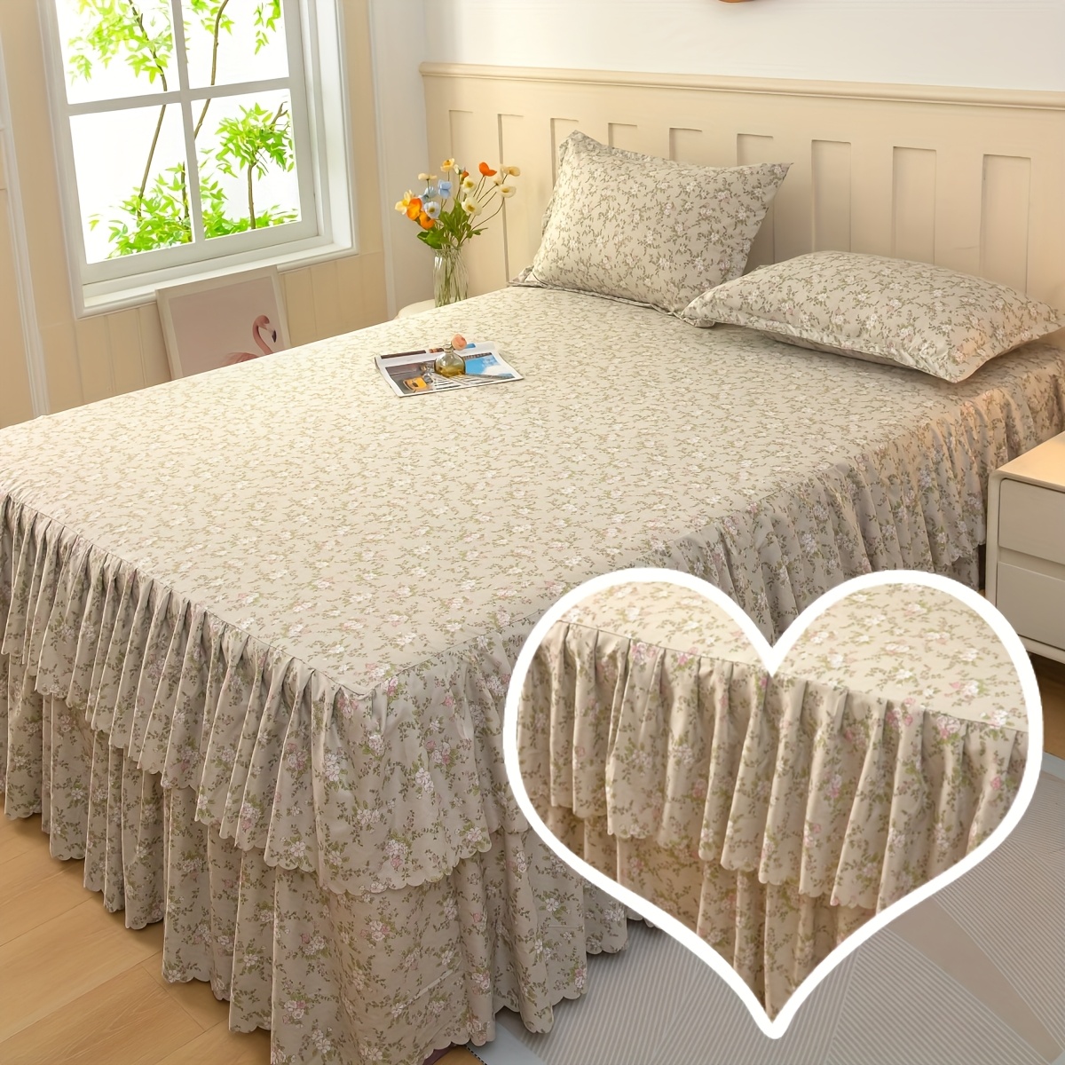 TEMU 로맨틱 더블 레이어 러플 디자인 침대 스커트 세트, 부드럽고 피부 친화적, 편안하고 통기성 좋음. 플로럴 디자인으로 침실에 차분한 느낌을 더해줍니다. 미끄럼 방지 S자형 스트랩 포함. 침구 세트 3피스: 침대 스커트 1개와 베개커버 2개 (베개 미포함)