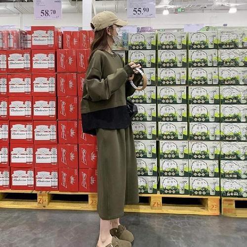 피로달 치마 그레이 여성용 투피스 초가을 이중 맨투맨 상의+화이트 정장세트 HO3