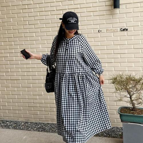 [다잇템]여자 깅엄 단추 깅엄체크 SS 큰사이즈 롱원피스 (45899628)