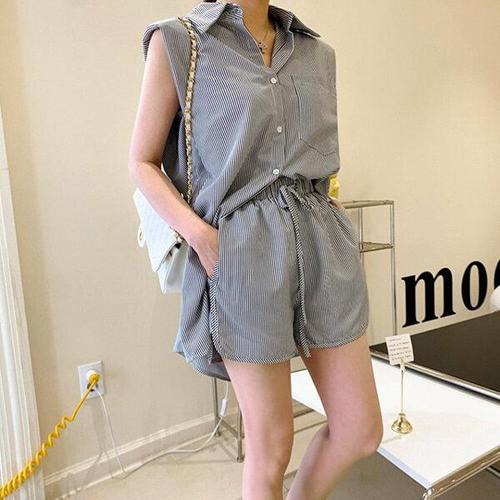 [굿쇼핑몰_의류]여름 심플 스트라이프 나시 셔츠 밴딩 팬츠 세트