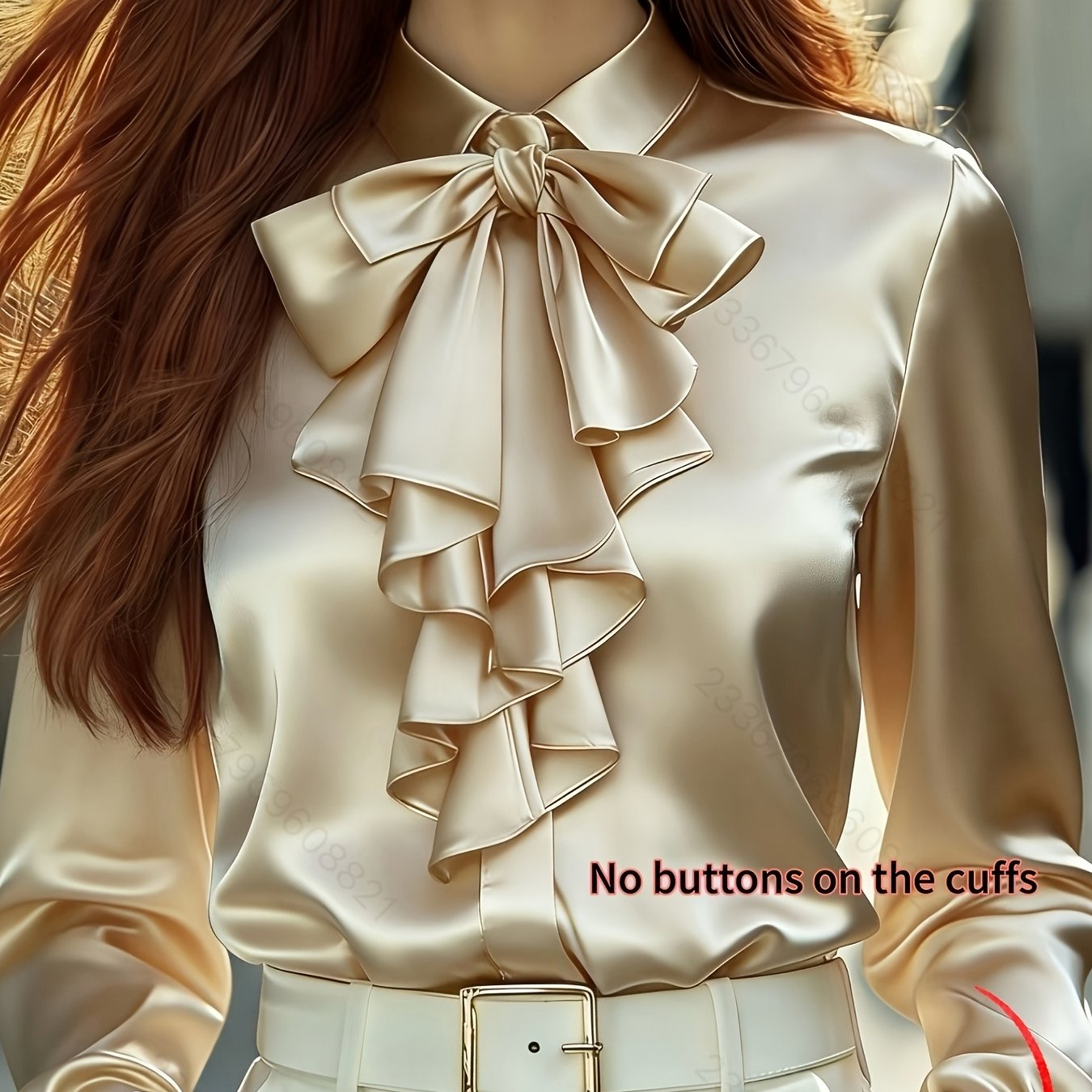 TEMU 여성용 우아한 리본 셔츠 칼라 로터스 레이스 블라우스 탑