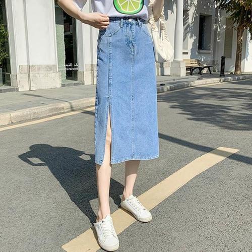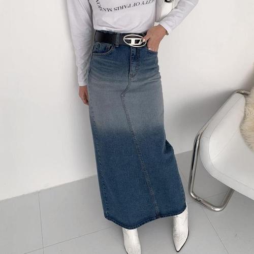 [다잇템]여성 진 일자 워싱 슬릿 데님 브러쉬 롱스커트 (10761188A)