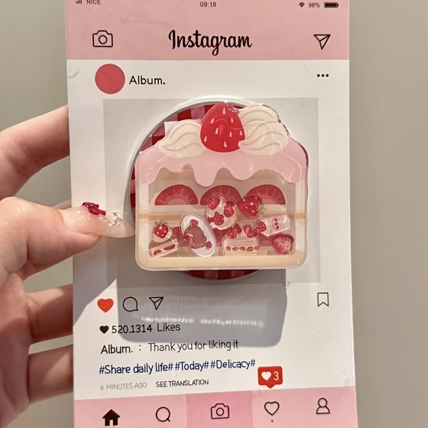 TEMU 이 니치 딸기 케이크 쉐이크 홀더는 MagSafe 폰과 호환되며, 강력한 자석 부착과 데스크탑 사용을 위한 수축형 디자인을 특징으로 합니다.