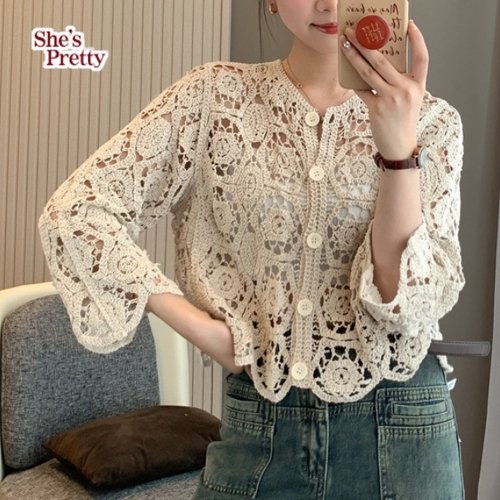 [탱커스]펀칭 그물 여름 긴팔 크롭 니트 가디건 (TV2CD005L0)