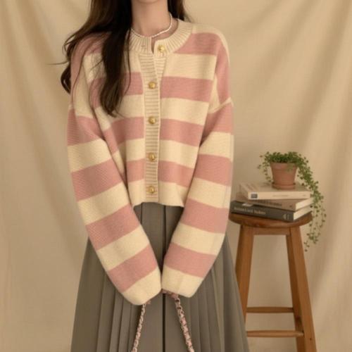 [옷자락] 여성 모던 클래식 배색 라운드 니트가디건