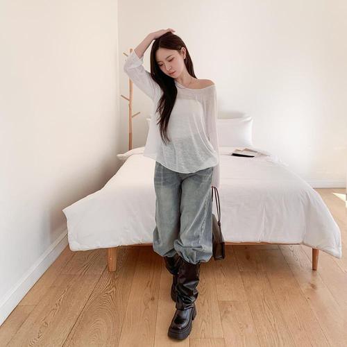 [미라클세븐]여성 시스루 긴팔 티셔츠 오버사이즈 라운드넥 가오리핏