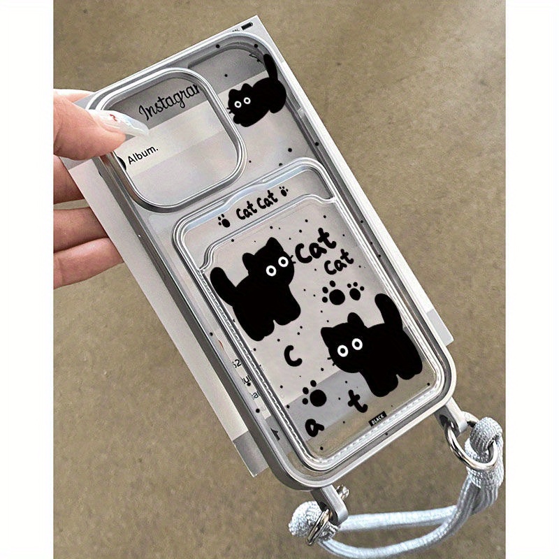 TEMU 블랙캣 귀여운 만화 전기 도금 실버 엣지 투명 휴대폰 케이스, 카드 슬롯 지갑 및 은색 랜야드 포함, 아이폰 16/15/14/13/12/11/12 미니/13 미니/XR/XS/XS MAX/16 프로 맥스/16 플러스/16 프로 호환