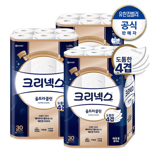 [유한킴벌리][4겹신상]크리넥스 4겹 울트라클린 롤화장지 25M-30롤X3팩