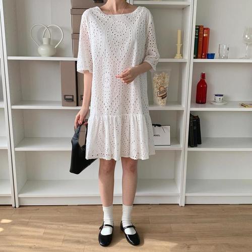 [다잇템]여자 반팔 화이트 후레아 에이라인 펀칭 원피스 (9890504A)