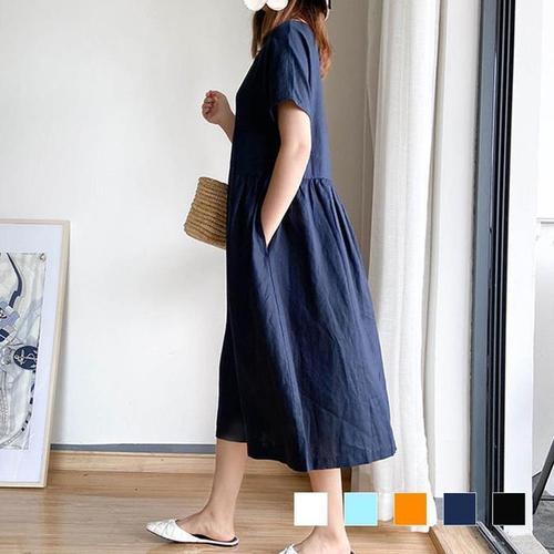 [다잇템]여자 에이라인 주머니 클래식 반소매 롱 원피스 (10629735A)