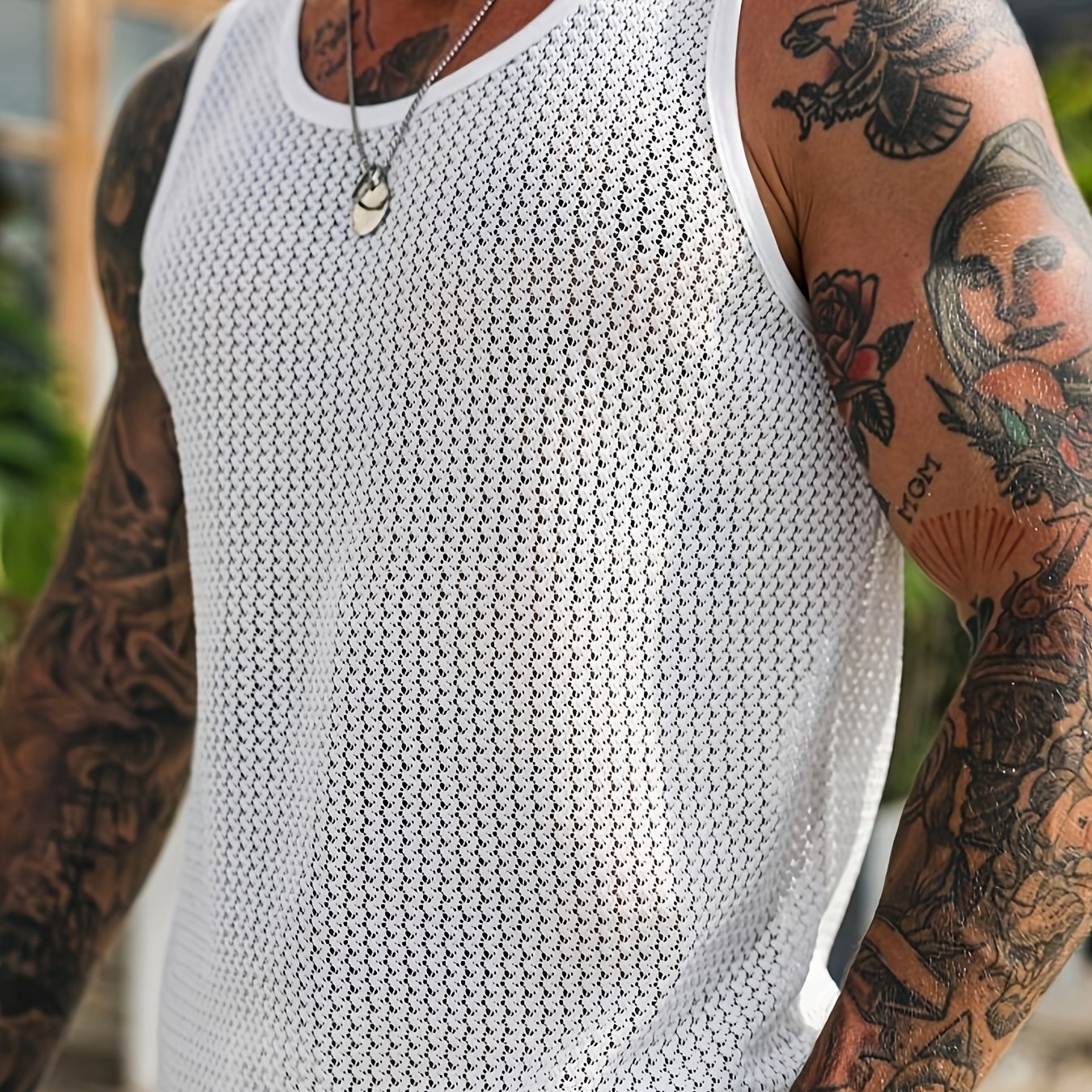 TEMU 남성용 솔리드 컬러 라운드넥 홀로우 니트 자카드 조끼, 캐주얼 여름 웨어