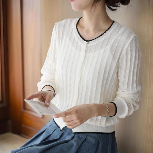 [신상오픈런]시스루 엠보싱 스트라이프 봄니트 투톤가디건 시보리 (31615015)