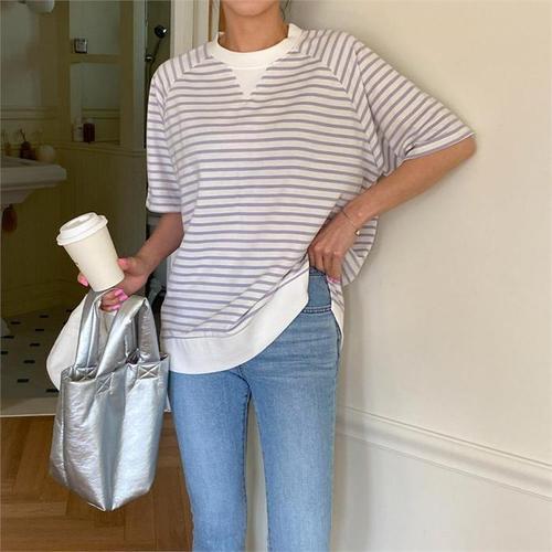 [다잇템]여자 봄여름 단가라맨투맨 라글란 튜닉 반팔티 (9807550A)