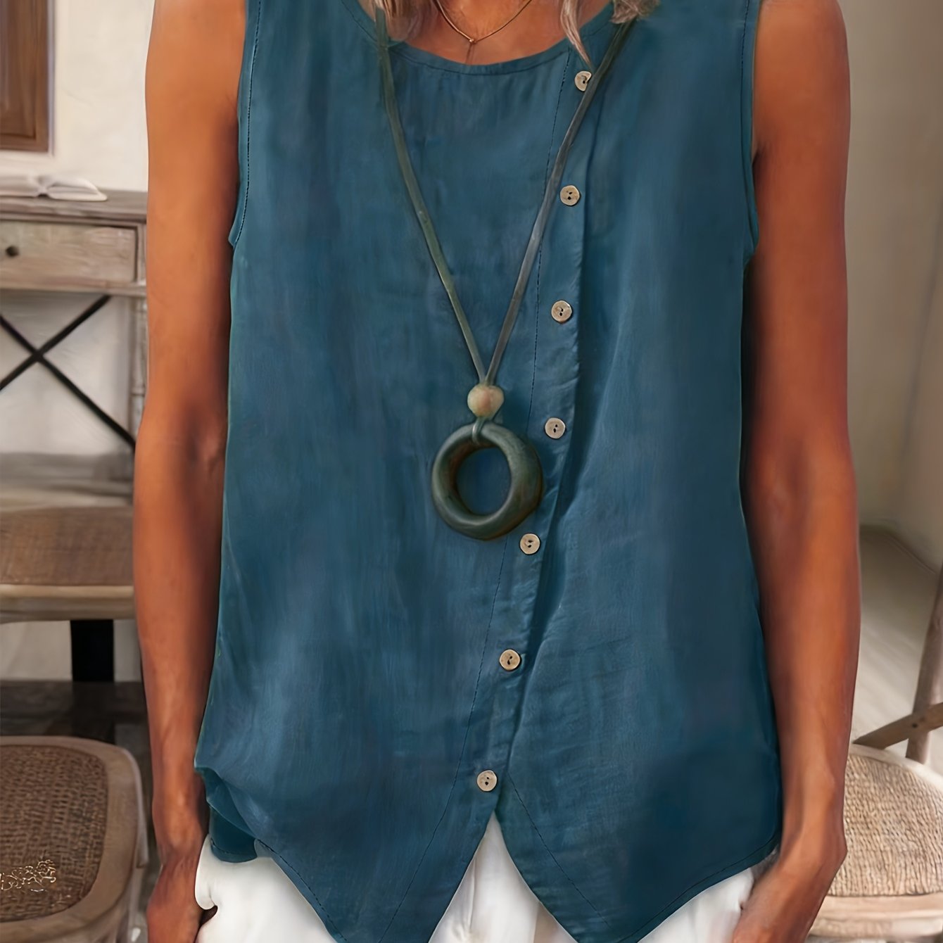 TEMU 여름 여성 캐주얼 민소매 패션 조끼 비대칭 버튼 사이드 라운드넥 다용도 탑
