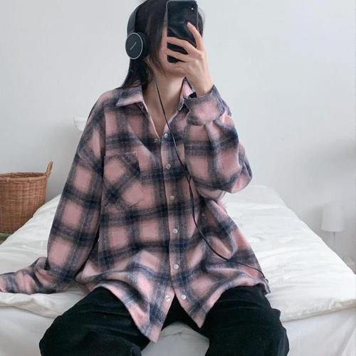 Makone 여성 봄 가을 루즈핏 체크 셔츠