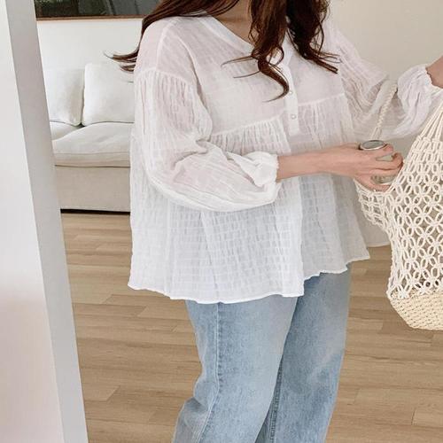 [다잇템]여자 잔주름 얇은 진주 환절기 버튼 블라우스 (10693949A)