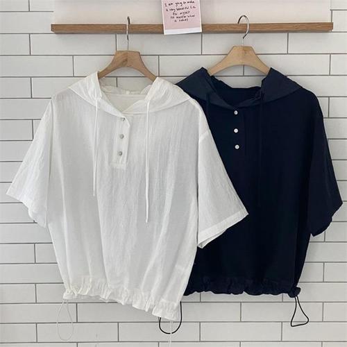[다잇템]여자 드로우코드 밑단 얇은 단추 민무늬 티셔츠 (9988621A)