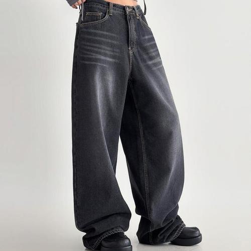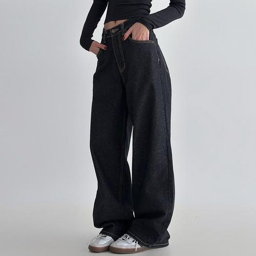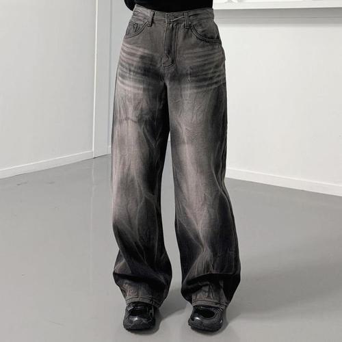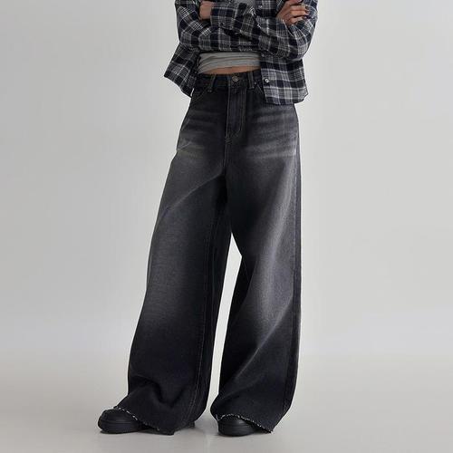 [다잇템]여자 검정데님 주름워싱 박시 롱 넓은 청바지 (25978007A)