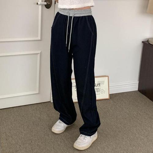 [다잇템]여자 검정 고무줄 넓은 콘트라스트 자수 청바지 (28508305A)