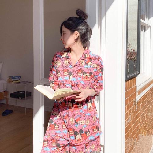 새로운 봄, 가을 잠옷 세트 여성 100% 코튼 긴 소매 바지 두 조각 사랑 사랑스러운 스위트 홈 가구 세트