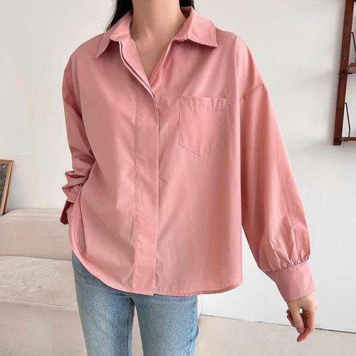 [다잇템]여자 힙커버 카라 봄남방 핑크 블라우스 (28831121A)