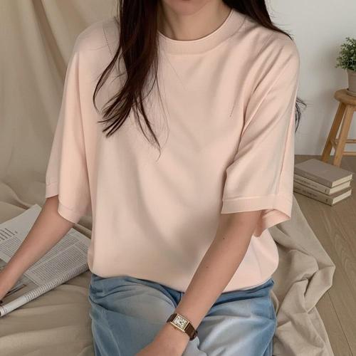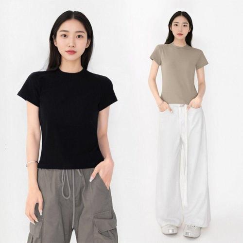ONM 여성 슬림 반목 반팔티 골지 니트티 5부 티셔츠