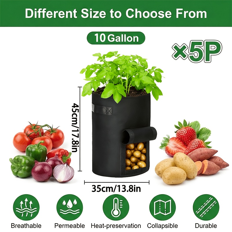 TEMU 감자 재배용 가방 5개, 손잡이가 있는 300g 두꺼운 부직포 화분, 통기성 있는 정원용 가방 및 화분, 감자, 토마토, 당근, 양파, 뿌리 채소용 정원 심기 키트