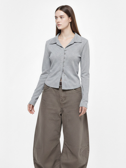 [챈세스노이 포 우먼] 오픈 카라넥 스트라이프 크롭 셔츠(그레이)/W261TP07