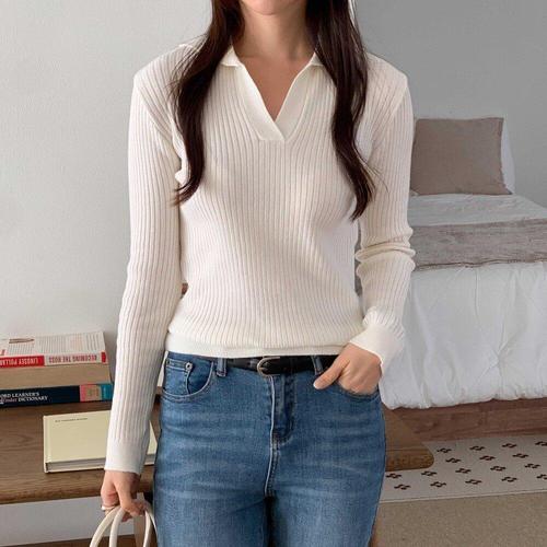 [옷자락]여자 오픈카라 골지 베이직핏 롱슬리브 데일리 봄 니트