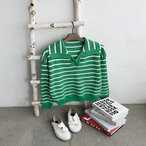 [MAXZA] 멀티 스트라이프 오픈 카라 니트